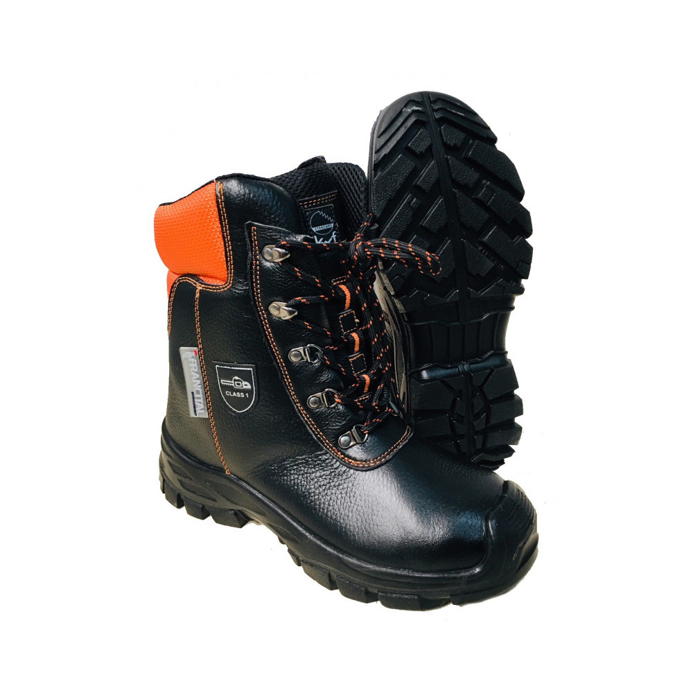 Botte de protection contre les coupures à lacets hauts avec embout en acier et semelle en PU avec acier anti-perforation. Le cuir de vachette hydrofuge garantit que vos pieds restent au sec. Confortable à porter. Hauteur 23cm. EN ISO 17249, Classe 1. Tailles 40-47.