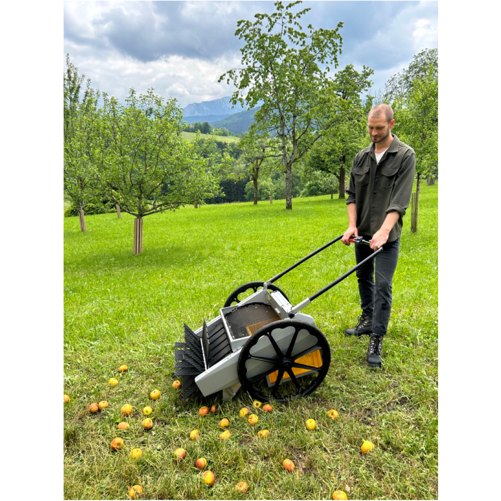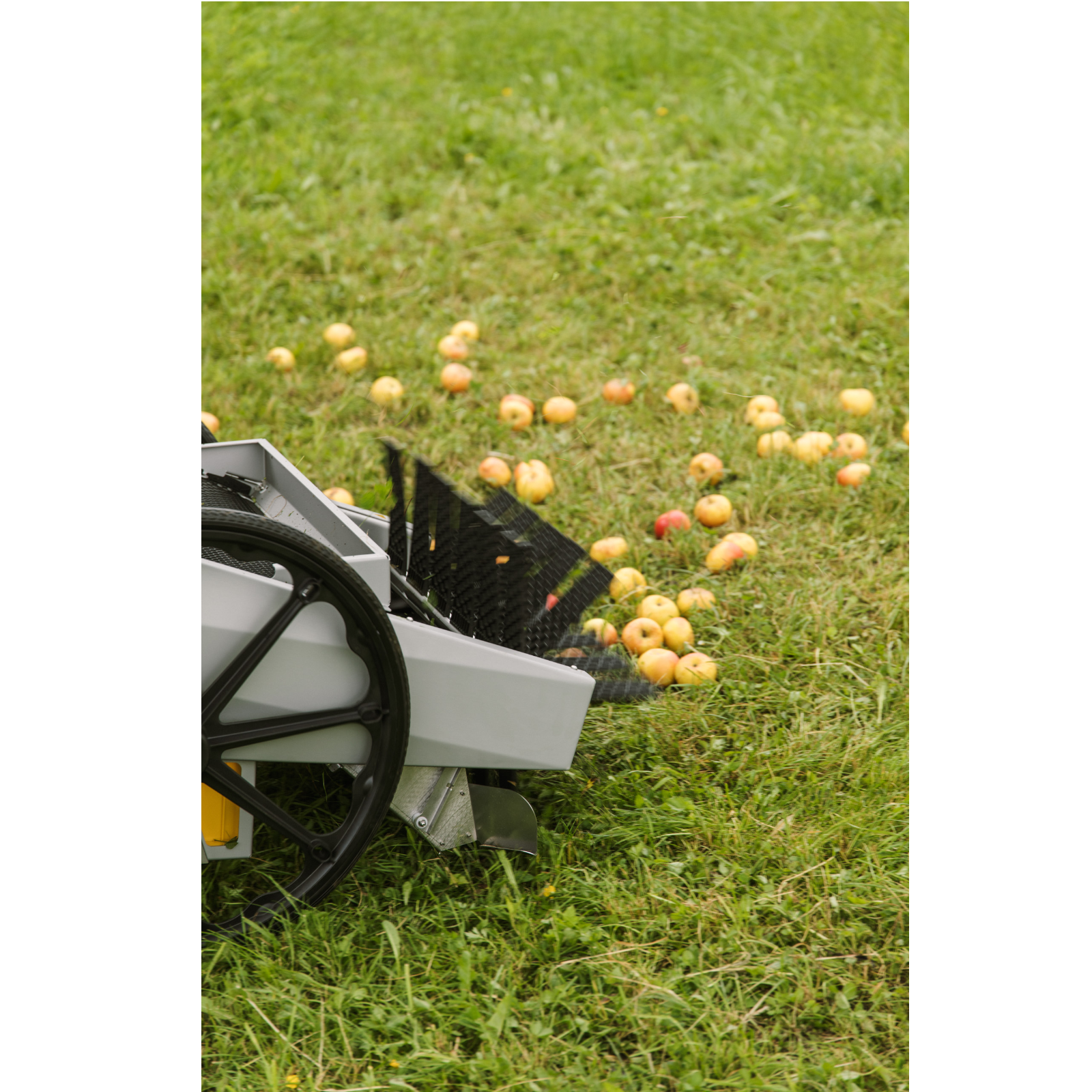 Qu'il s'agisse de noisettes, de noix, de poire à cidre, de strudel aux pommes ou de châtaignes - la chenille à fruits est le seul appareil de récolte de fruits qui vous permet de récolter de nombreux types de fruits et de noix sans aucune modification. Grâce aux lamelles souples, l'absorption des fruits est très douce et fonctionne même avec des fruits mous. Les fruits sont transportés dans des caisses standards (60 x 40 x 17 cm) rapidement échangeables. Des boîtes à langer supplémentaires peuvent être transportées sur l'appareil. L'appareil léger et maniable se pousse à la main et convient aux pentes jusqu'à 50 % et aux longueurs d'herbe jusqu'à 15 cm. Le rouleau de ramassage à entraînement électrique (largeur de travail de 60 cm et 48 lattes de ramassage) et le contrôle de vitesse en continu génèrent une propulsion de soutien par rotation. De plus, la conception uniaxiale assure une adaptation optimale aux irrégularités et aux creux. Le principe de collecte fonctionne en avant et en arrière pour une flexibilité maximale. Les feuilles sont séparées proprement par un rideau de brosse. Une fois pliée, la chenille à fruits est facile à soulever et compacte à transporter.