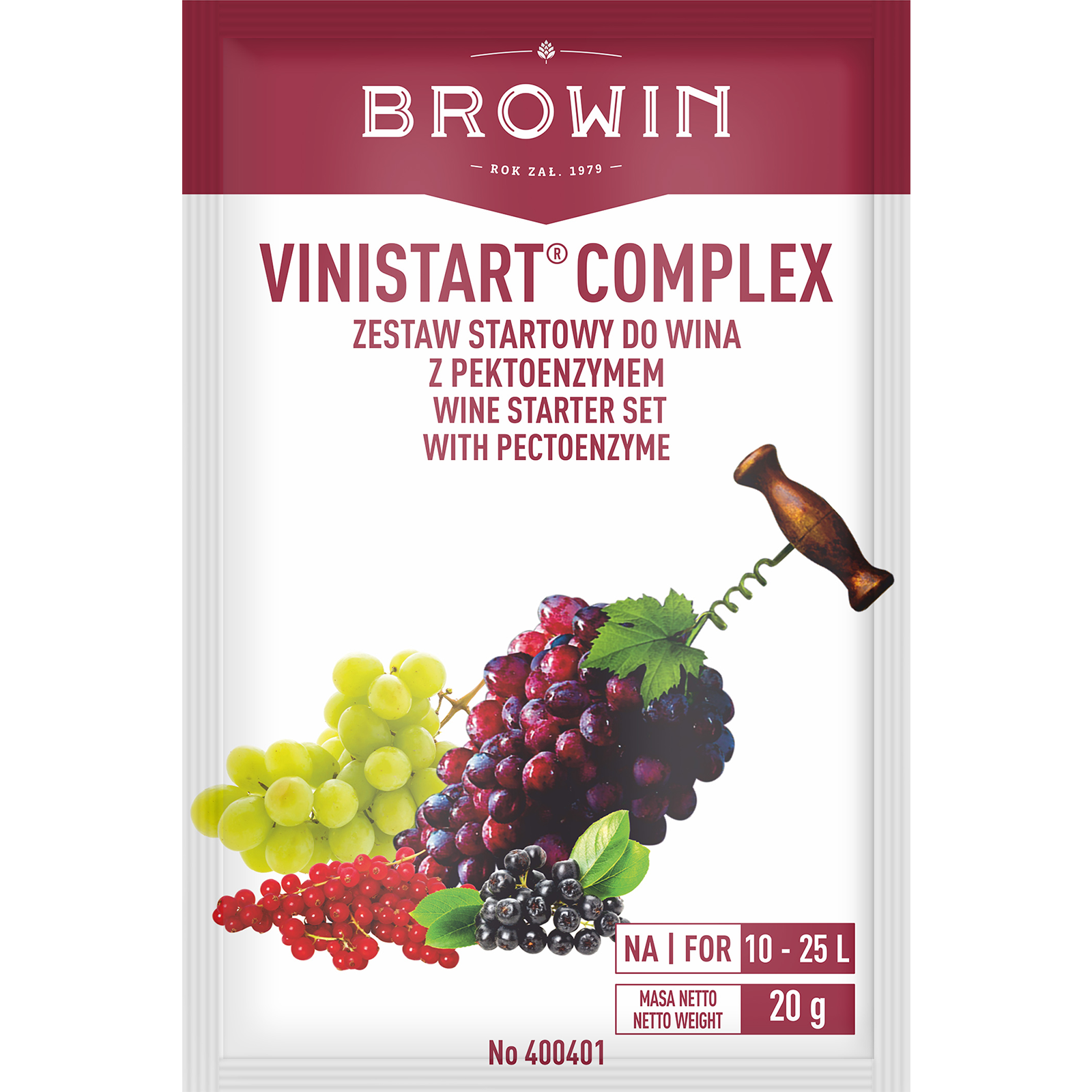- Complexe Vinistart - une combinaison d'une souche de levure noble, de sels nutritifs appropriés et de pectinase - une enzyme naturelle qui permet l'extraction du jus des fruits et favorise la clarification de vin,