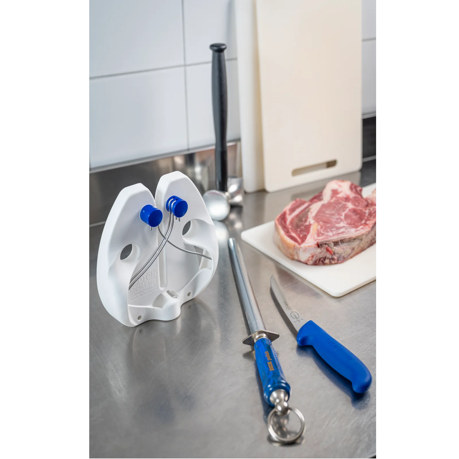 • Baguettes d'affûtage en acier inoxydable pour une durée de vie et une hygiène maximales.