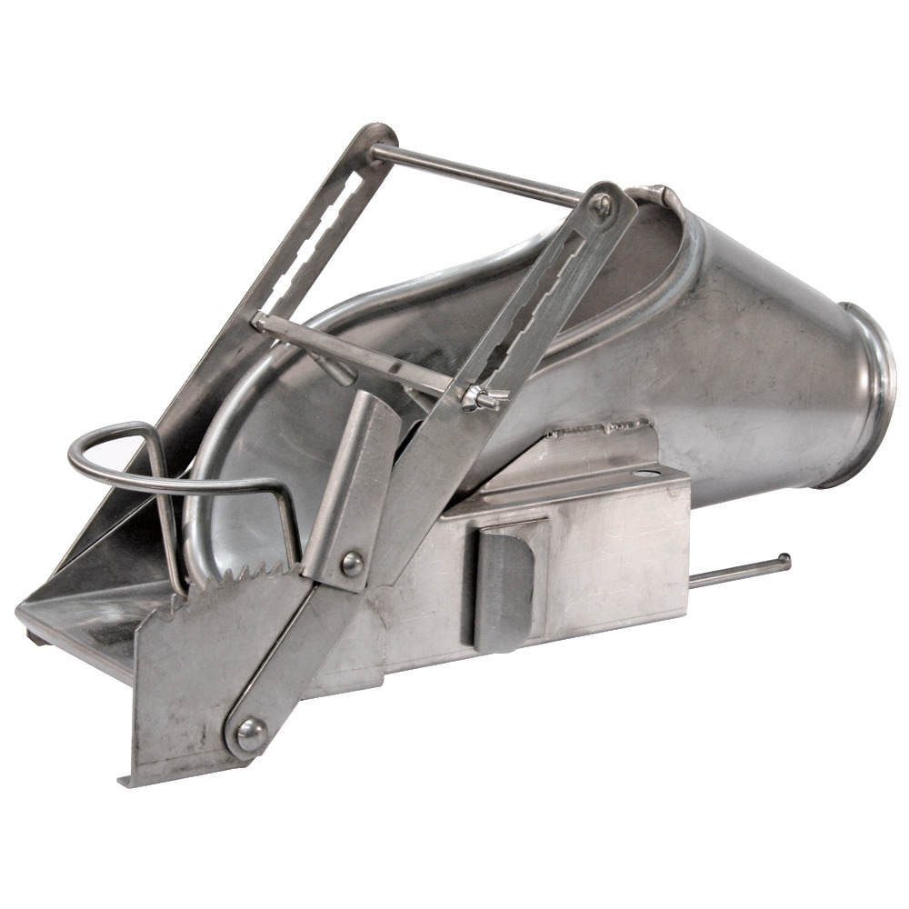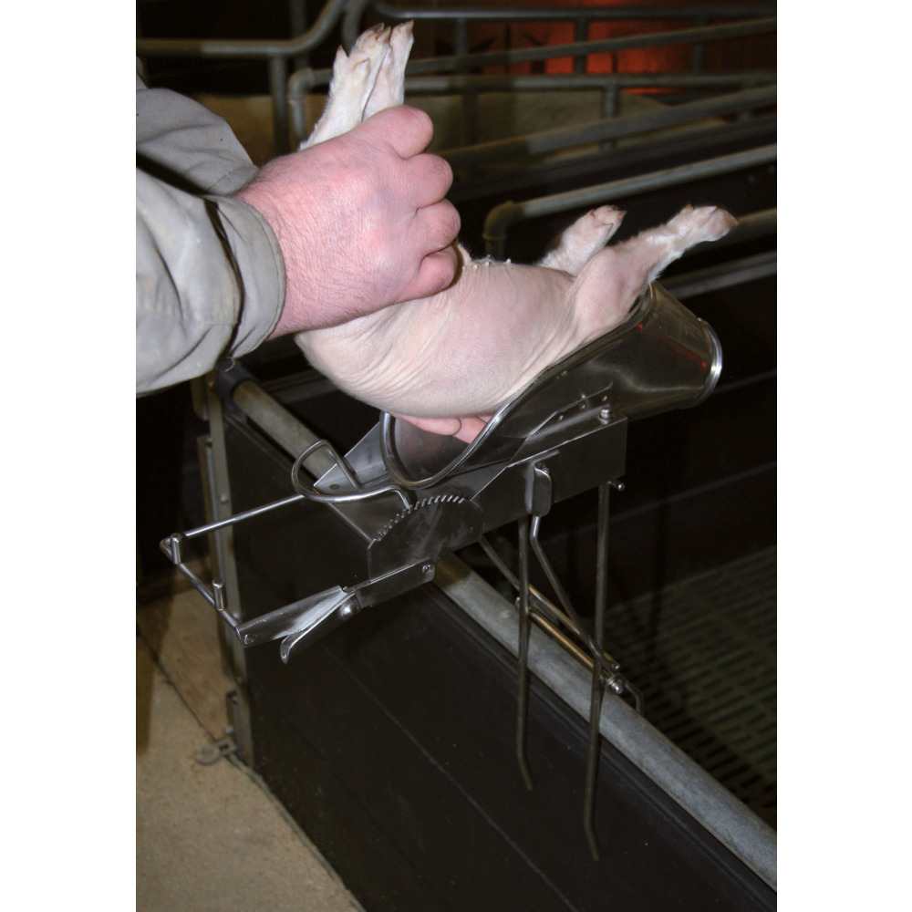 À monter sur la cloison de séparation de la maternité. Le porcelet est placé allongé sur le dos, tête en avant dans l'appareil. En fixant une pince vers la tête, les pattes postérieures sont fixées et la moitié inférieure du corps est tendue. La castration peut désormais être réalisée par une seule personne. Peut également être utilisé pour d'autres procédures. Hygiénique et facile à nettoyer car entièrement fabriqué en acier inoxydable. Support (n° 74406) non inclus. Veuillez respecter les réglementations locales en matière de protection des animaux !