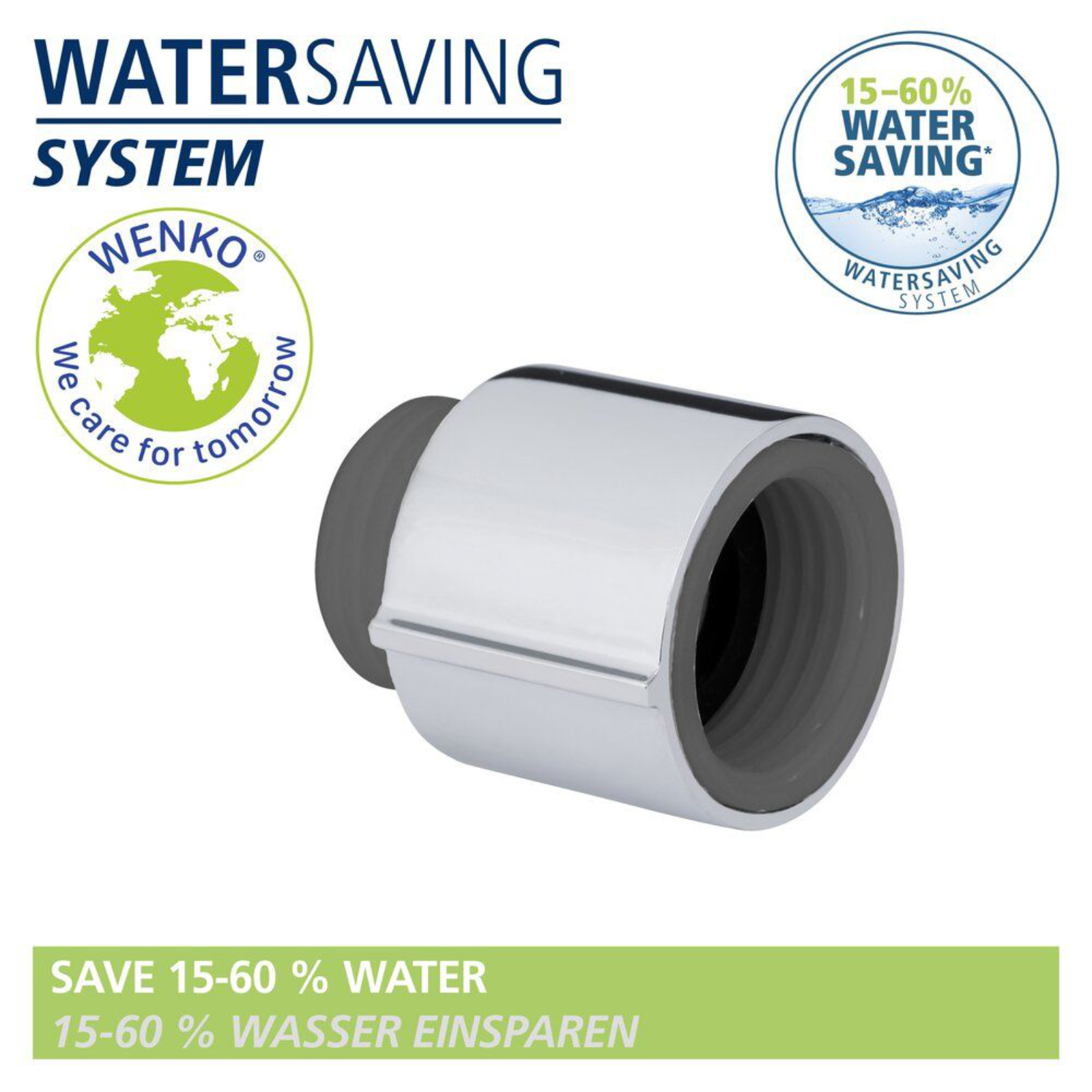 Petit investissement, grand impact : avec le dispositif « Économie d'eau » de WENKO, réduisez votre consommation d'eau sous la douche jusqu'à 60 %, sans compromis sur le confort. Le débit est réglable selon vos besoins.