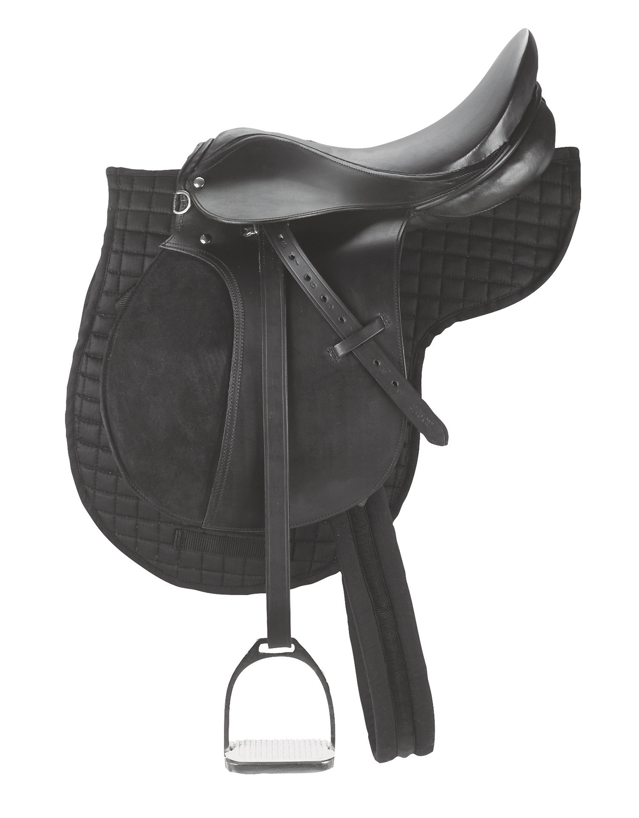 Taille confortable (17,5″), comprenant le couvre-selle, la sangle de selle (longueur 125 cm), les étrivières et les étriers.