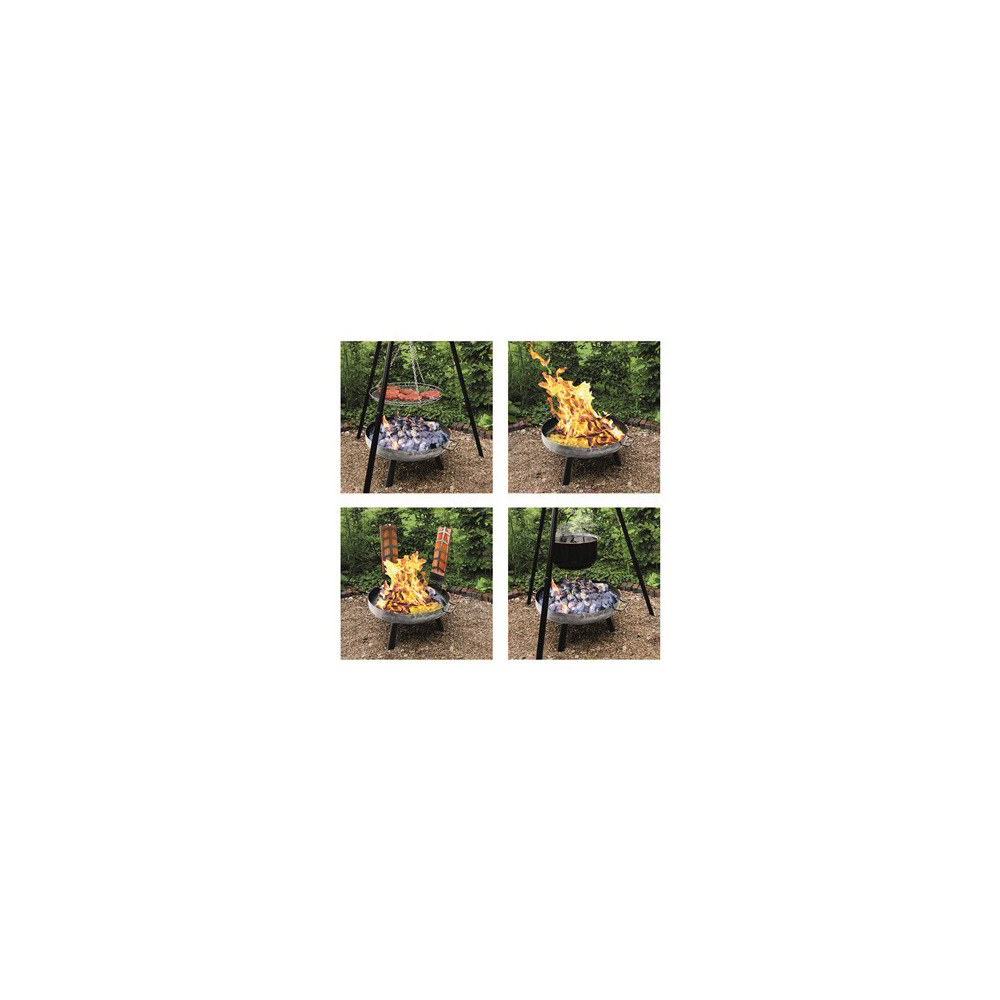 - Gril pivotant avec brasero : Le brasero lourd et de haute qualité d'un diamètre de 60 cm sert de base pour le gril pivotant. Grâce au palan à chaîne, la hauteur du gril peut être réglée individuellement. Parfait pour la romance et la chaleur du feu de camp lors des soirées fraîches. Idéal pour griller de la viande, des légumes et bien plus encore.