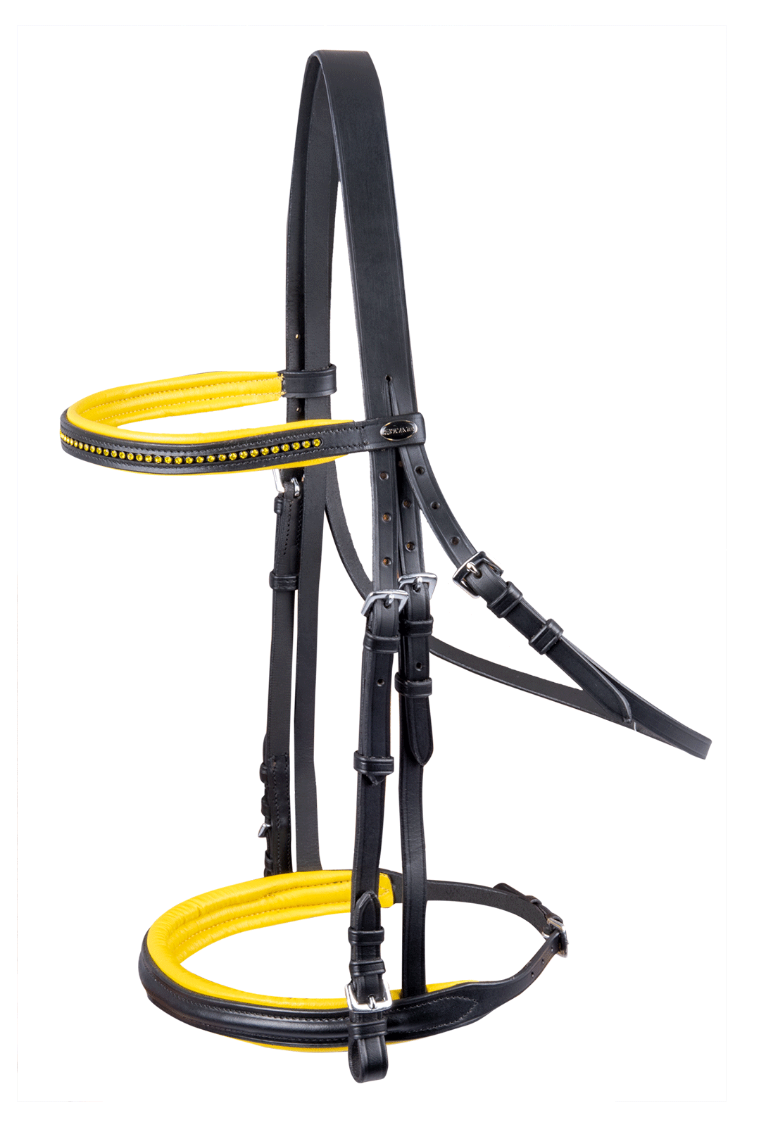 Muserolle combinée anglaise - Têtière droite - Frontal droit avec chaîne en strass colorés - Muserolle et arceau légèrement doublés - Ferrures en fer nickelé - Couleur marron avec ferrures couleur laiton br>- Rênes en sangle 19 mm, 16 mm chez Shetty