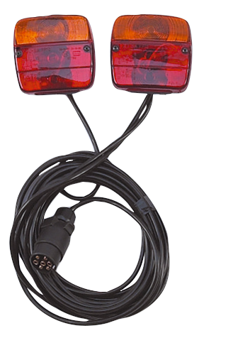 Avec câble de raccordement de 10 m ainsi que feu arrière, feu stop, feu clignotant, éclairage de plaque d'immatriculation, avec fiche et ampoules, largeur maximale 4 m.