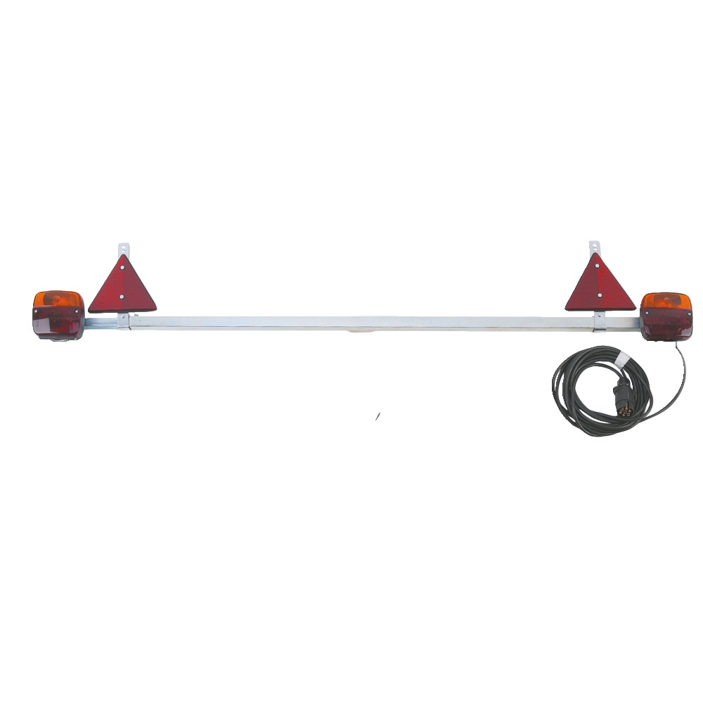 Complet avec feu arrière, feu stop, clignotant et éclairage de plaque d'immatriculation ainsi que câble de connexion de 7,5 m, réglable : 1,1 m - 1,7 m, à 7 broches. Fiche (sans douille), 2 réflecteurs triangulaires, avec ampoules.