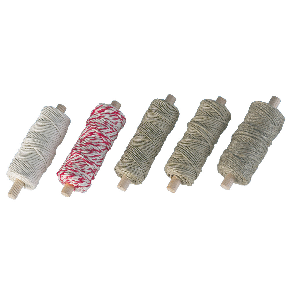 composé de : 2 morceaux de ficelle à rôtir blanc, rouge/blanc 100% PES, 3 morceaux de ficelle à saucisses, 100% fibres naturelles