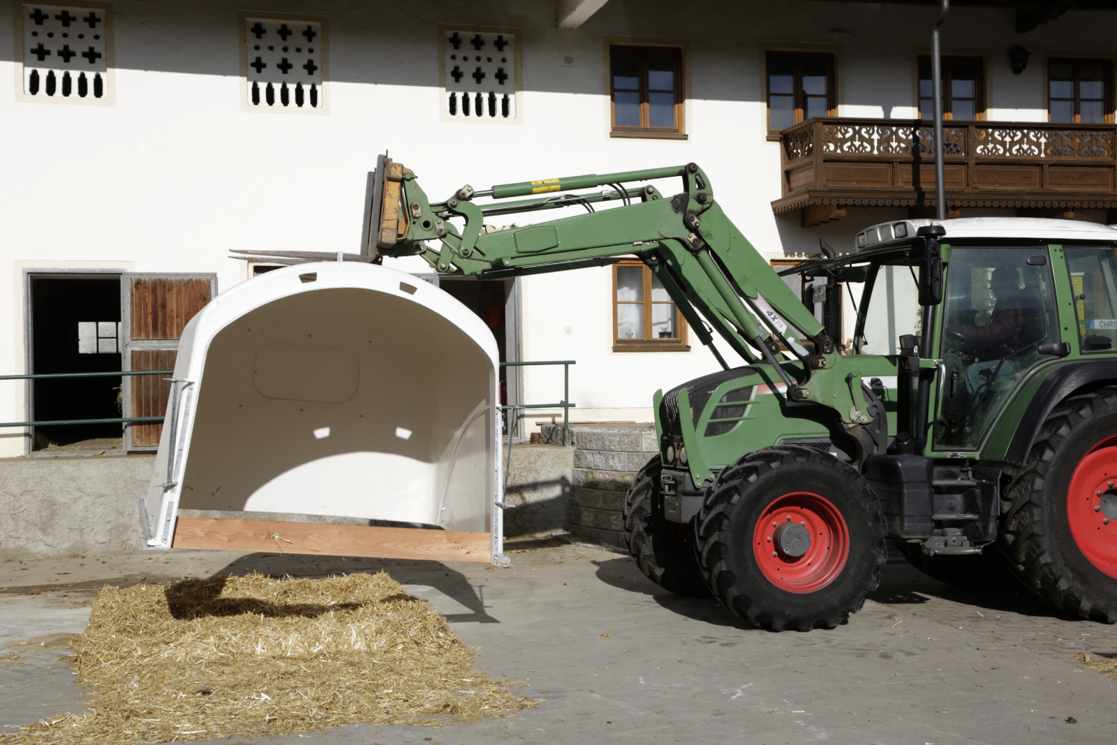 En plastique renforcé de fibres de verre. Peut accueillir jusqu'à 5 veaux (les réglementations locales en matière de protection des animaux doivent être respectées). Une fenêtre coulissante est installée à l'arrière, ce qui facilite notamment le contrôle des animaux et le remplissage du râtelier à foin en option. Le cadre de renfort supplémentaire autour de l'abri pour veaux garantit une stabilité maximale.