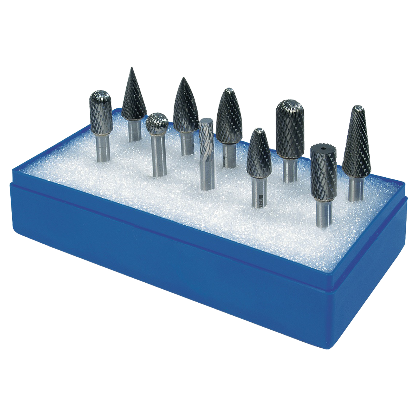 Denture croisée · Tige Ø 6 mm Composé de 1 fraise chacun : Forme cylindrique sans denture frontale 6 x 18 mm, 10 x 20 mm Forme à rouleau rond 10 x 20 mm, 12 x 25 mm Forme à arc rond 10 x 20 mm, 12 x 25 mm forme sphérique 10 x 9,0 mm forme cône rond 12 x 32 mm forme cône pointu 12 x 25 mm forme arc brisé 12 x 25 mm, dans une cassette en plastique.