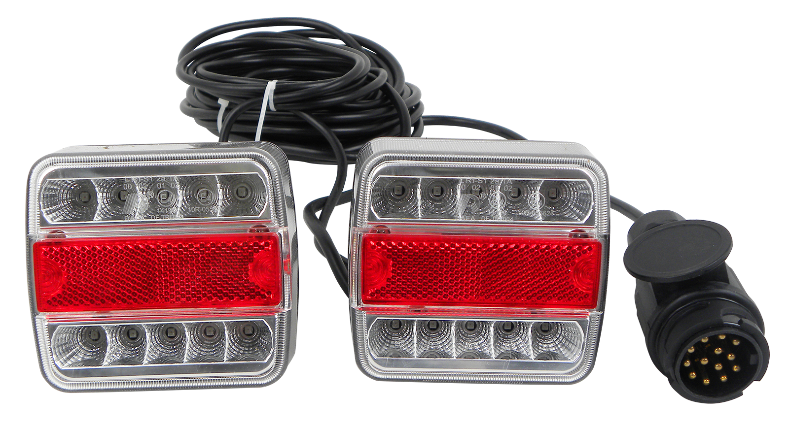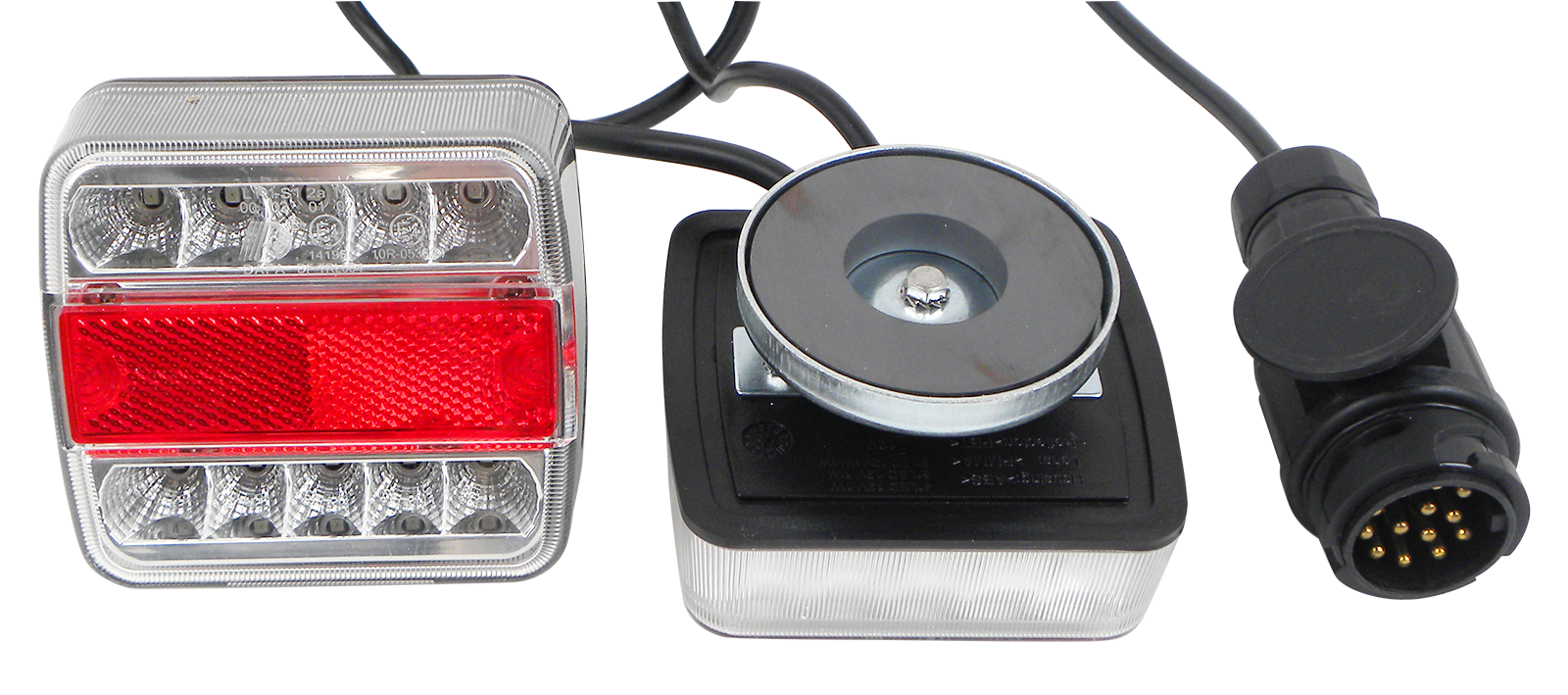 2 x 5 rangées de LED (plaque d'immatriculation = 4 LED), aspect verre transparent, boîtier soudé étanche, Dimensions environ LxHxP : 105x100x35 mm , 12 V, utilisable à droite et à gauche, avec câble intermédiaire de 2,5 m et câble de connexion de 7,5 m, 13 broches. Connecteur, support magnétique, affectation selon ISO 11446 (ne peut pas être utilisé pour les systèmes à 7 broches)