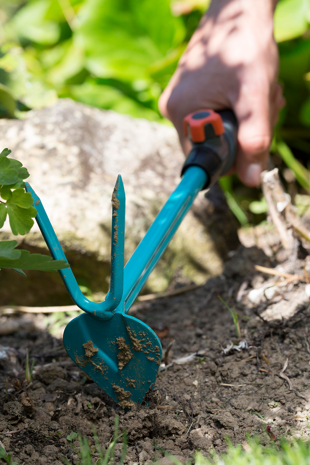 Pour ameublir, aérer et désherber le sol Avec la petite houe combisystem GARDENA avec poignée, vous pouvez facilement ameublir et aérer le sol et désherber les mauvaises herbes. La petite houe à deux dents et Une lame en forme de cœur a une largeur de 6 cm, elle est fabriquée en acier de haute qualité et le revêtement thermodurci assure une longue durée de vie.