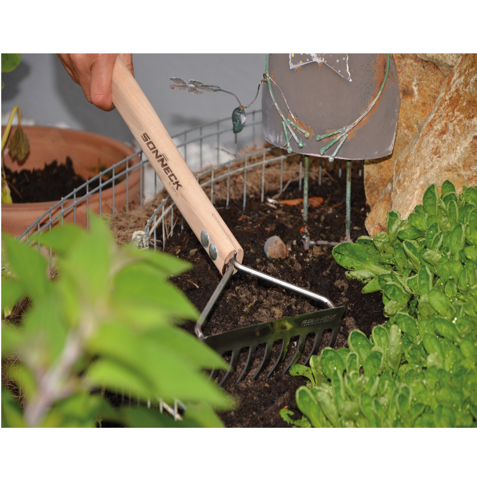 La grande portée de l'outil permet un travail respectueux du dos sur les plates-bandes surélevées et dans les petites plates-bandes.
