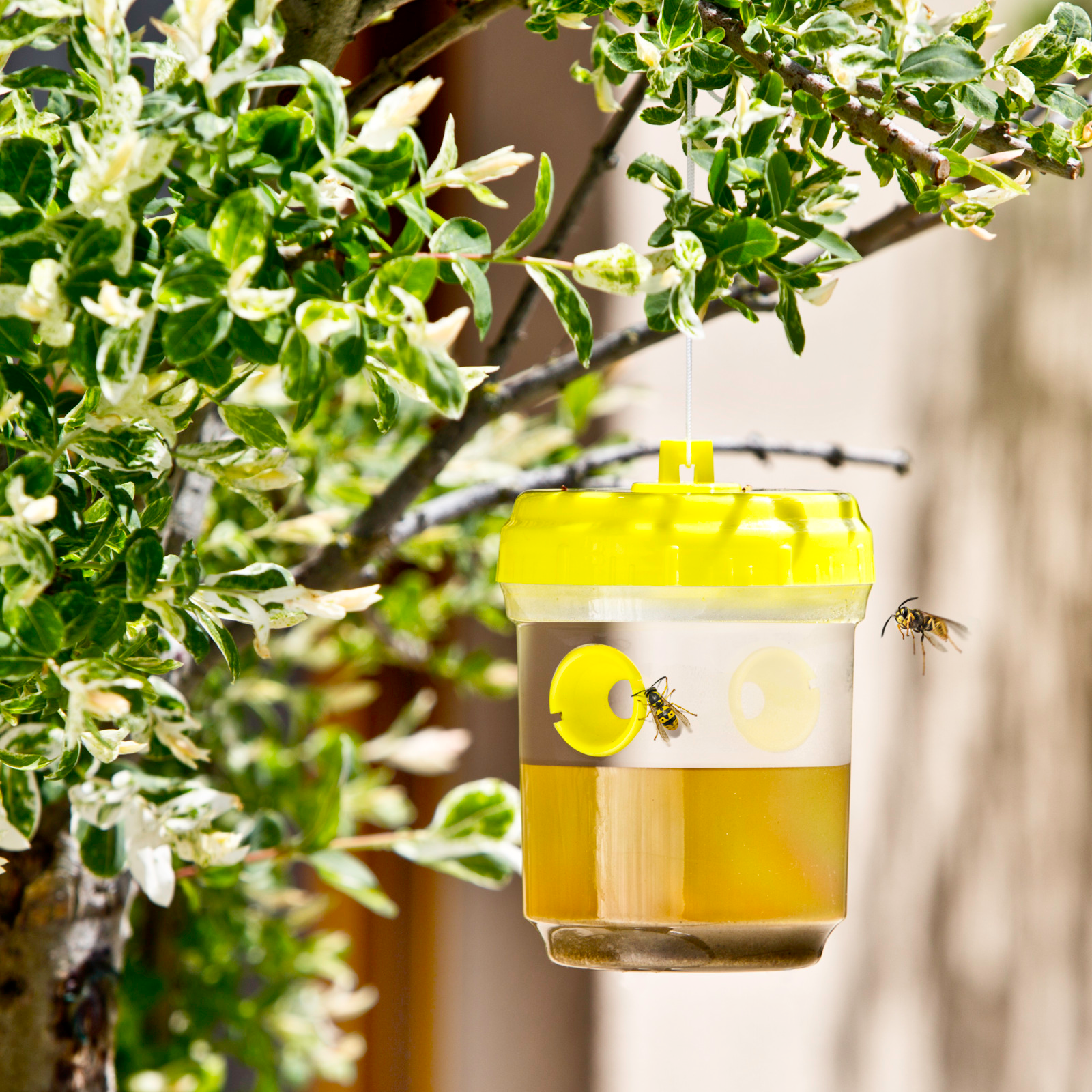 Les guêpes sont attirées comme par magie par la douce odeur des desserts ou des fruits, ainsi que par l'odeur épicée de la viande. C'est bien que le piège à guêpes et son attractif dégagent un arôme encore plus intense et que la peste des guêpes reste à l'écart de vos délices culinaires. Posé ou suspendu, ce piège vous servira fidèlement pendant plusieurs étés. Un effet secondaire positif : les mouches et les moustiques se perdent également dans le piège.