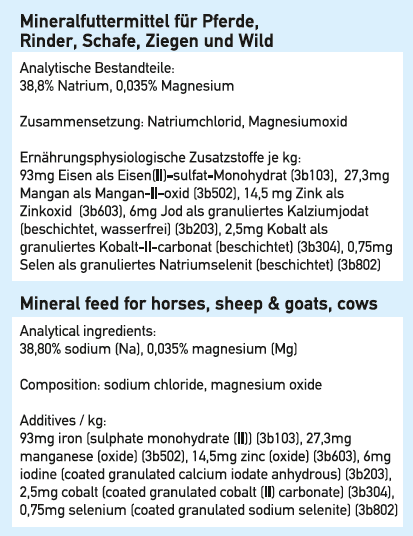 Chlorure de sodium, oxyde de magnésiumAdditifs physiologiques nutritionnels par kg : 93 mg de fer sous forme de sulfate de fer (II) monohydraté (3b103), 27,3 mg de manganèse sous forme de manganèse ( II) oxyde (3b502), 14,5 mg de zinc sous forme d'oxyde de zinc (3b603), 6 mg d'iode sous forme d'iodate de calcium granulé (enrobé, anhydre) (3b203), 2,5 mg de cobalt sous forme de carbonate de cobalt (II) granulé (enrobé) ( 3b304) , 0,75 mg de sélénium sous forme de sélénite de sodium granulé (enrobé) (3b802)