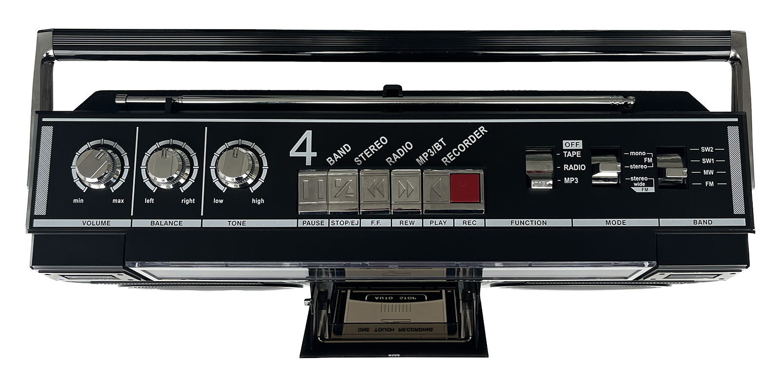 Cassette avec lecture, pause, arrêt automatique, avance/retour