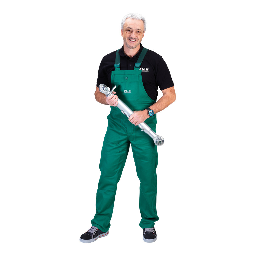 En 100% coton 240 g/m², 1 poche bavette et 2 poches pantalon devant, 1 poche mètre, bavette dos avec élastique, bretelles en caoutchouc avec boucle, braguette pantalon et fente latérale avec fermeture bouton. Taille 44-56