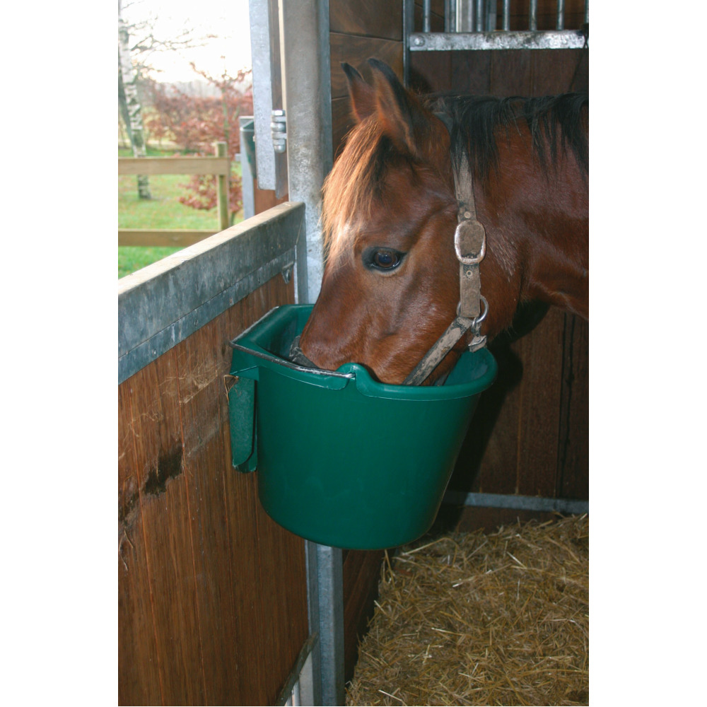 Le seau est accroché au mur et sécurisé. Cela signifie que les animaux ne peuvent pas soulever le seau du raccord et se blesser. Prix sans tenture murale. Contenu 20 litres, y compris le marquage des litres.