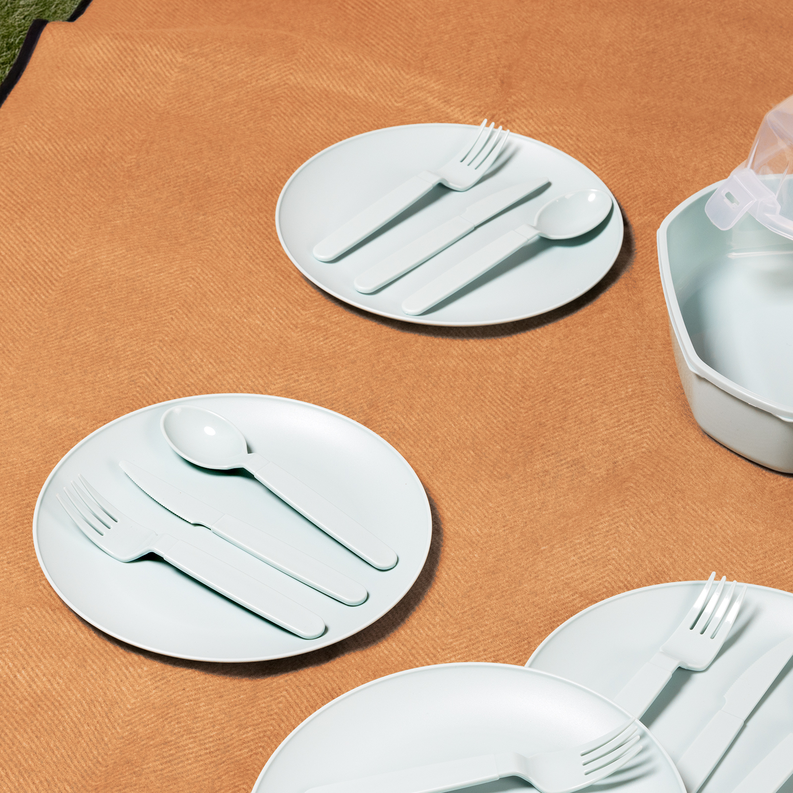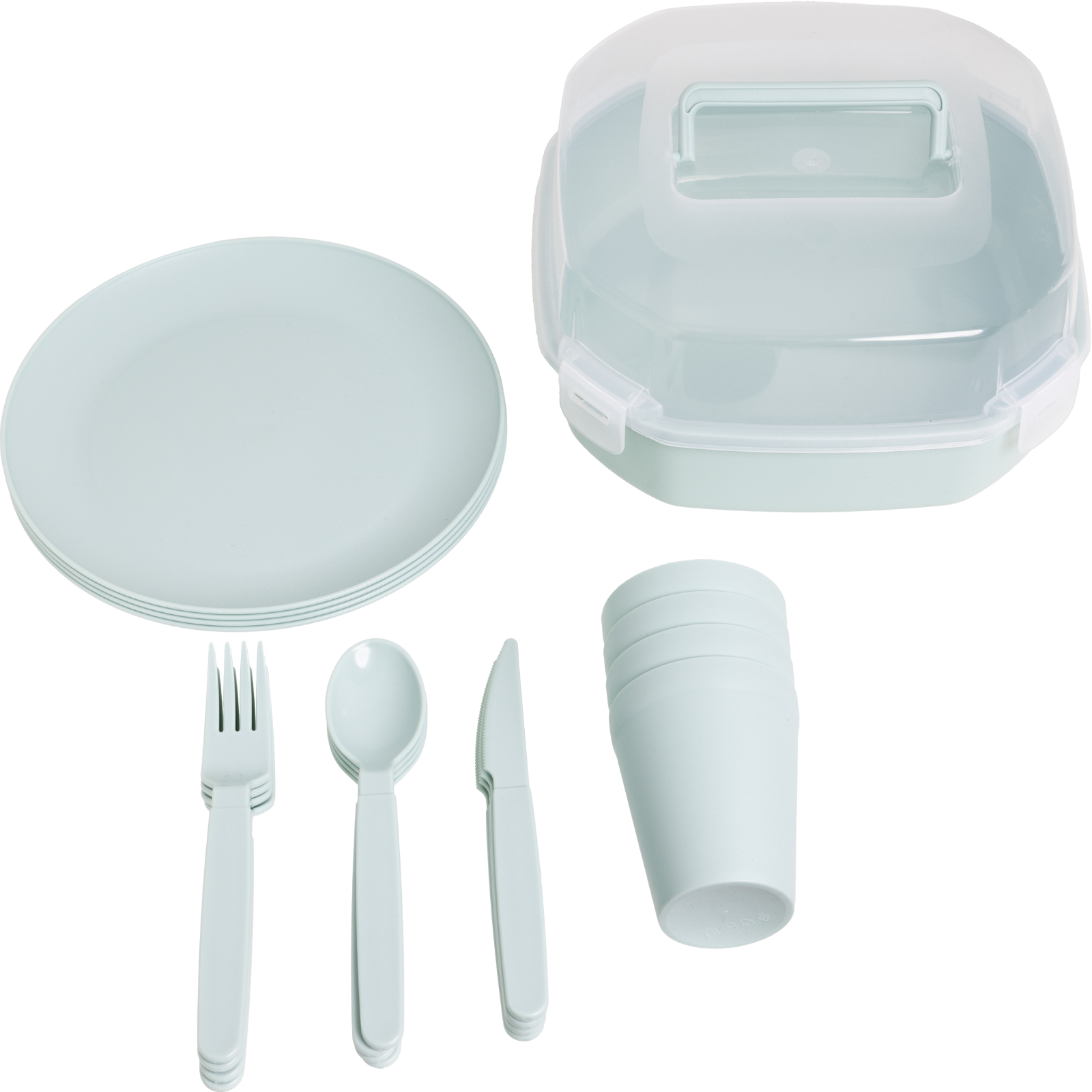 Le set contient tout ce dont vous avez besoin pour un repas en plein air : Assiettes, gobelets, cuillères, fourchettes et couteaux - chacun en plusieurs exemplaires.