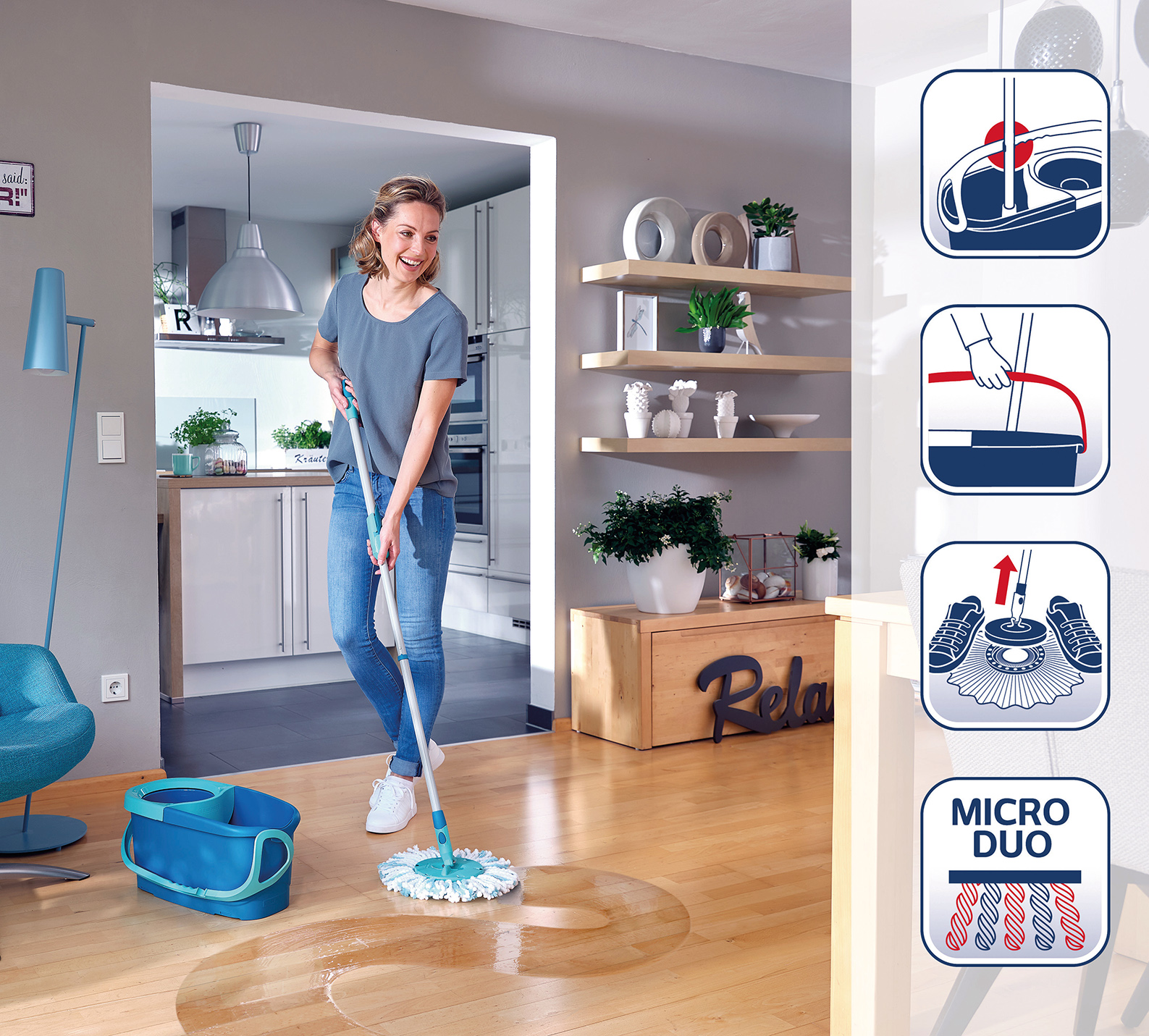 Ensemble complet prêt à l'emploi : manche télescopique avec mécanisme de perçage, seau de 6 litres avec tamis centrifuge et serpillière Micro Duo. Un mécanisme de poignée de perçage breveté pour éjecter facilement la vadrouille en position debout, sans plonger vos mains dans l'eau sale. La fonction pratique Spin-Stop permet un dosage individuel de l'humidité de la housse de vadrouille. Le cardan à angle plat à 360° permet un essuyage facile dans les lignes serpentines, même dans les endroits difficiles d'accès. Une poignée réglable en longueur (109-140 cm) pour un essuyage respectueux du dos à la hauteur de travail optimale.