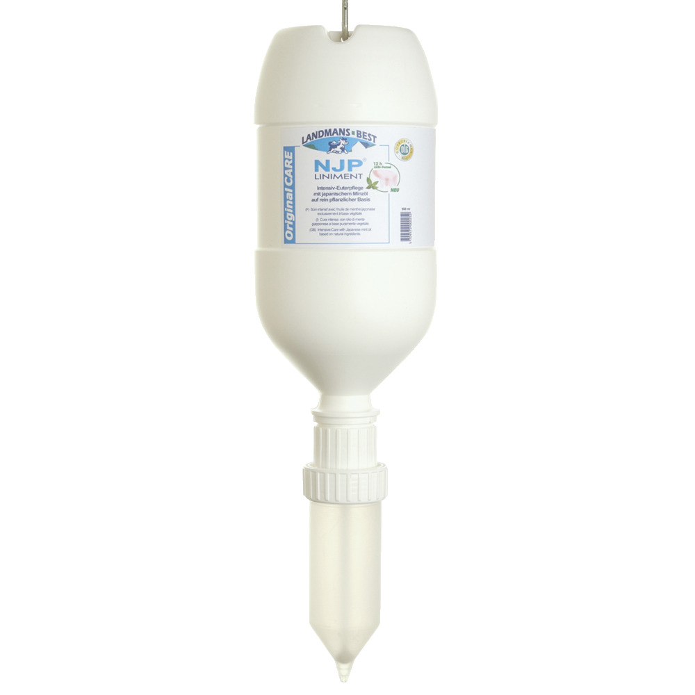 Produit de soin du pis de haute qualité avec de l'huile de menthe poivrée japonaise de qualité pharmaceutique et des substances de soin précieuses. Active la résistance naturelle des mamelles stressées sous un stress élevé. Les tissus stressés du pis sont protégés longtemps grâce à la formule active spéciale. Le liniment NJP original n'est soumis à aucun délai d'attente et possède le label de qualité DLG. Répertorié InfoXgen - adapté aux fermes biologiques ! (Livré sans tétine !)