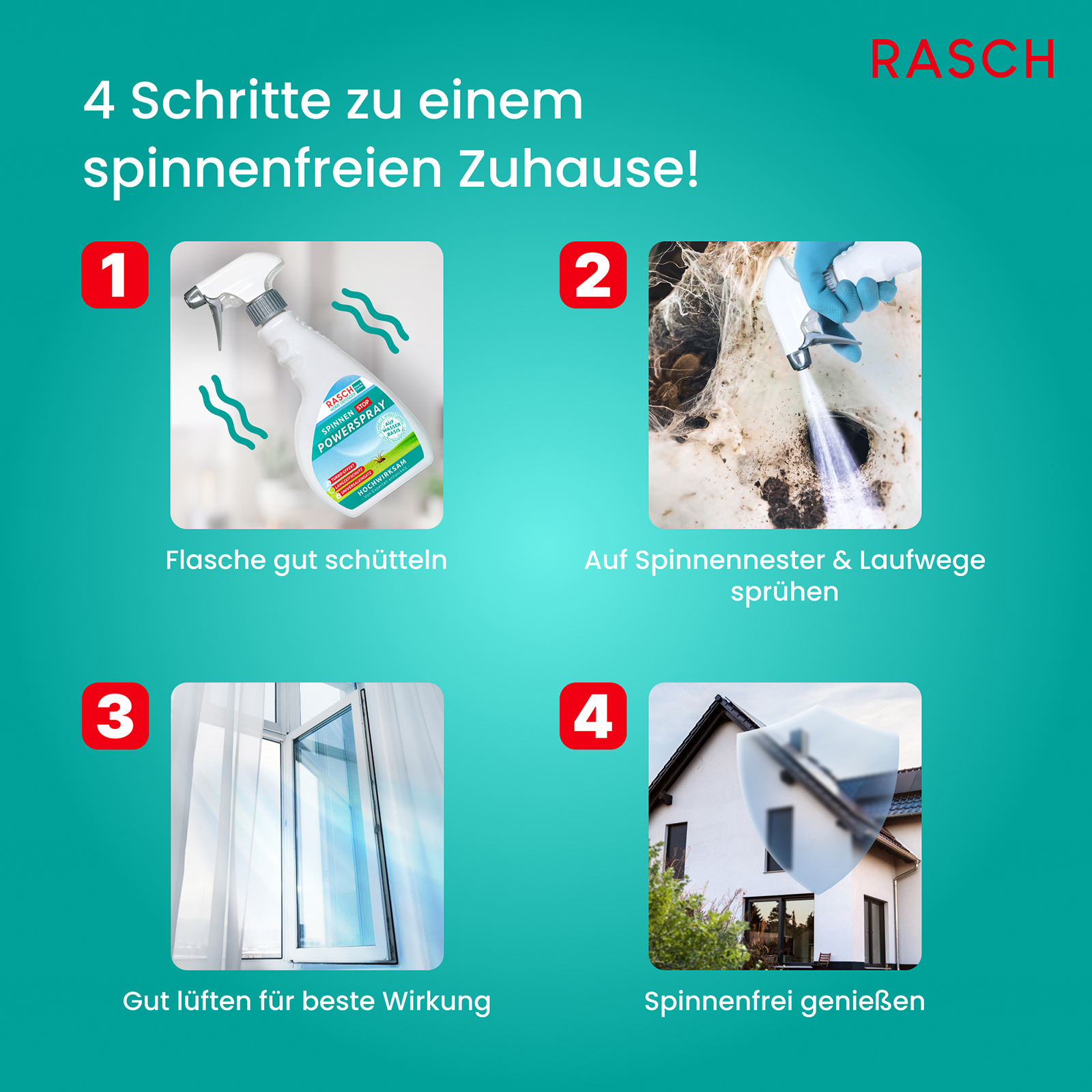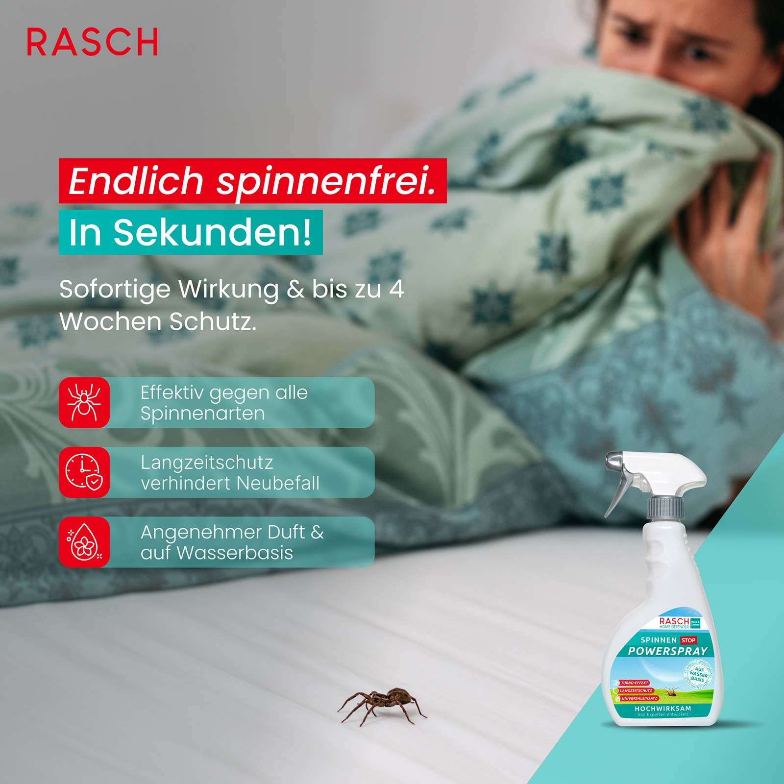 La solution efficace contre les araignées domestiques ! Bien agiter avant l'application et vaporiser à 30 cm sur les zones concernées. Aérer ensuite soigneusement les pièces et les textiles traités pendant 2 à 3 heures. Flacon vaporisateur de 500 ml