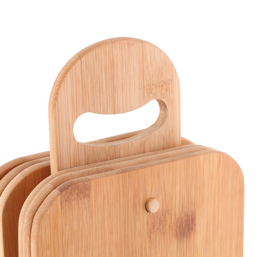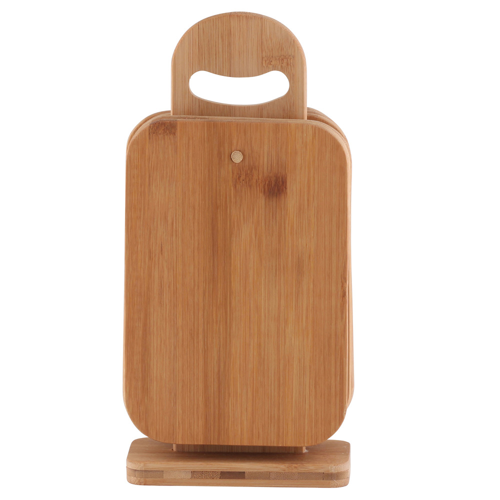 Le support en bambou avec 6 planches présente une haute résistance aux coupures, protège la lame du couteau et est facile à nettoyer. Taille de la planche : environ 22 x 0,8 x 15 cm Dimensions totales LxlxH : 15 cm x 7 cm x 31,5 cm. Lavage à la main recommandé.