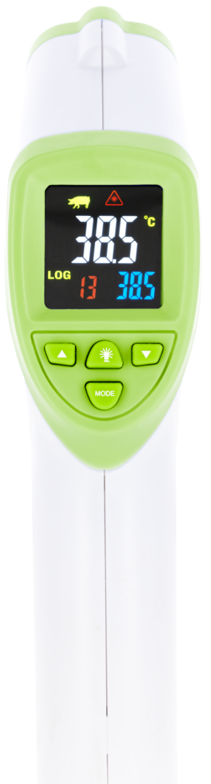 Polyvalence: le thermomètre peut être utilisé comme thermomètre frontal chez l'homme, pour mesurer la température de liquides, de murs ou de nids, mais surtout chez les animaux. Il est particulièrement adapté aux porcs, aux bovins ou aux chevaux.