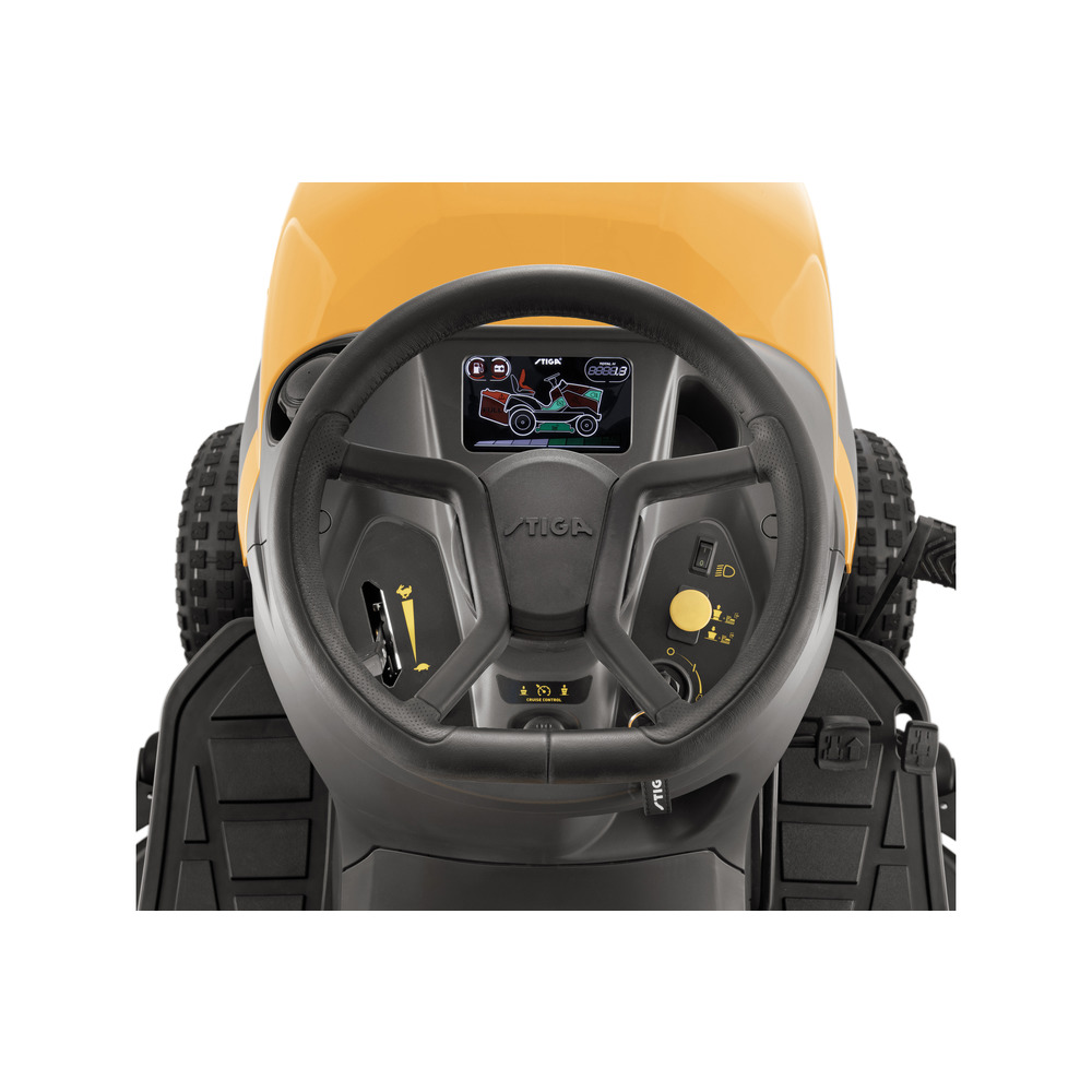 - Le confort est assuré par le siège avec accoudoirs et le volant à poignée souple roue garantie