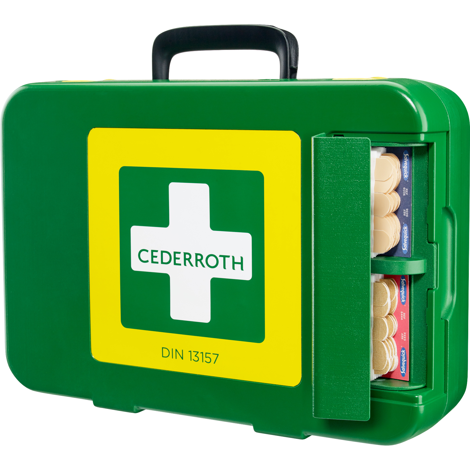 Trousse de premiers secours robuste et durable en plastique rigide, conforme à la norme DIN 13157, avec distributeur de pansements à l'extérieur.
