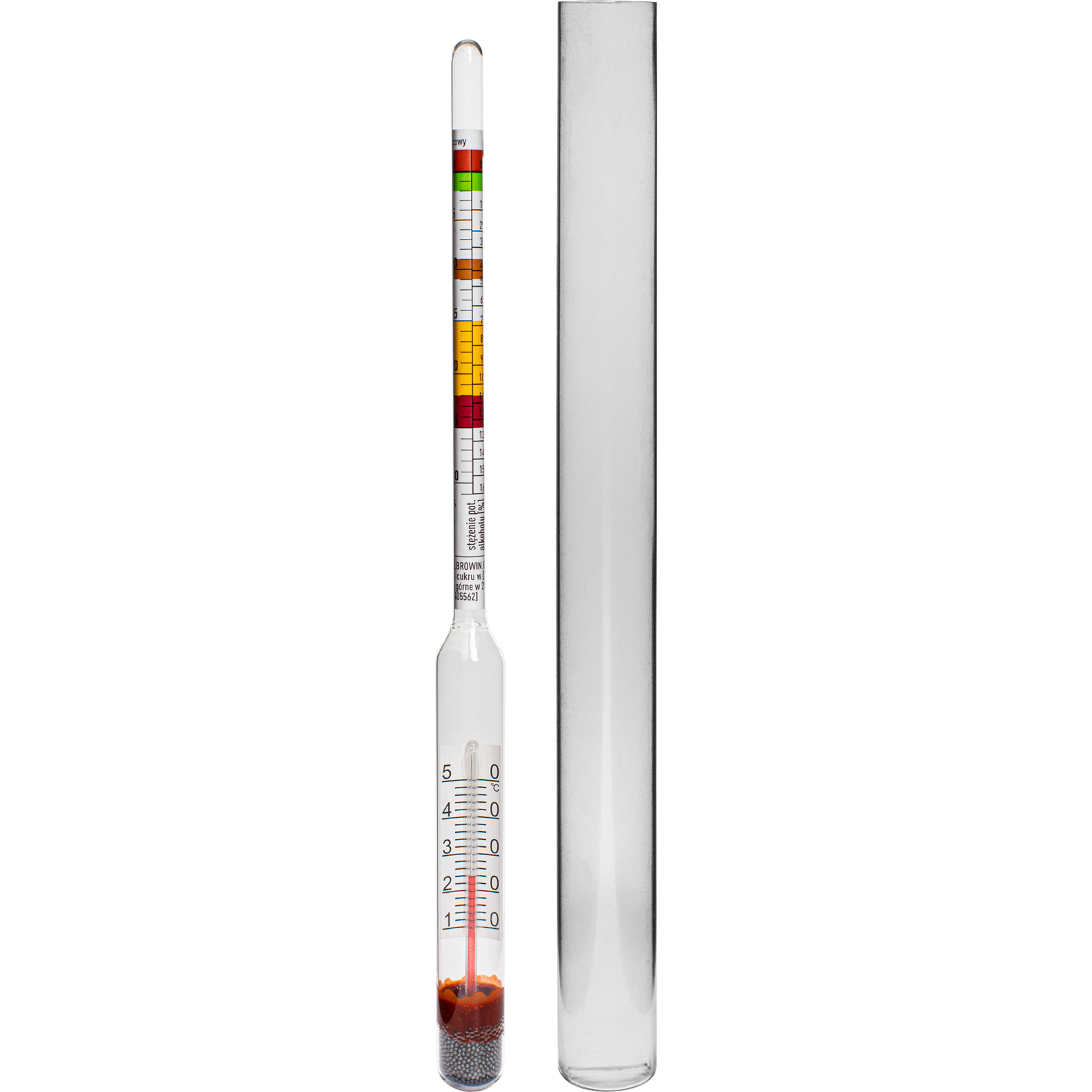 Tube à essai avec bouchon - le tube à essai a un capuchon qui empêche l'hydromètre de glisser pendant le transport vers un autre endroit ou le stockage.Mesure facile - l'instrument est exceptionnellement facile à utiliser. La mesure se prend directement au thermomètre au centre de l'aréomètre - grâce au contact pratiquement direct avec la paroi de l'aréomètre (pointe du capillaire), il mesure la température du liquide sans falsification. Ce saccharimètre vinomètre est un indispensable instrument permettant de déterminer rapidement et précisément la teneur en sucre de la cuvée ou du moût de bière.