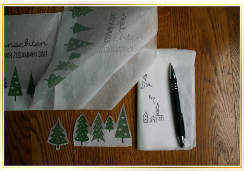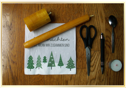 Une fois le motif choisi, sépare la couche de papier imprimée de la serviette des couches inférieures. Découpe le motif ou des parties du motif. Lors du choix des couleurs, fais attention au fait que la cire d'abeille a une couleur propre très intense et que, de ce fait, toutes les couleurs similaires sont peu ou pas du tout visibles ou altérées.