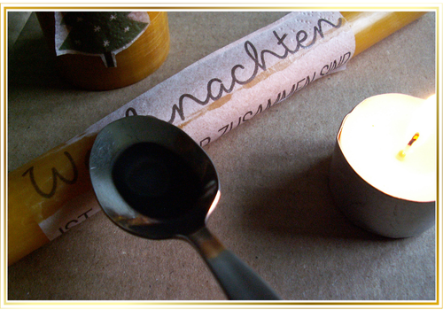 Chauffer brièvement une cuillère en métal (pas de bords tranchants !) avec le côté creux au-dessus de la flamme d'une bougie. La suie s'y dépose, mais peut être facilement essuyée !